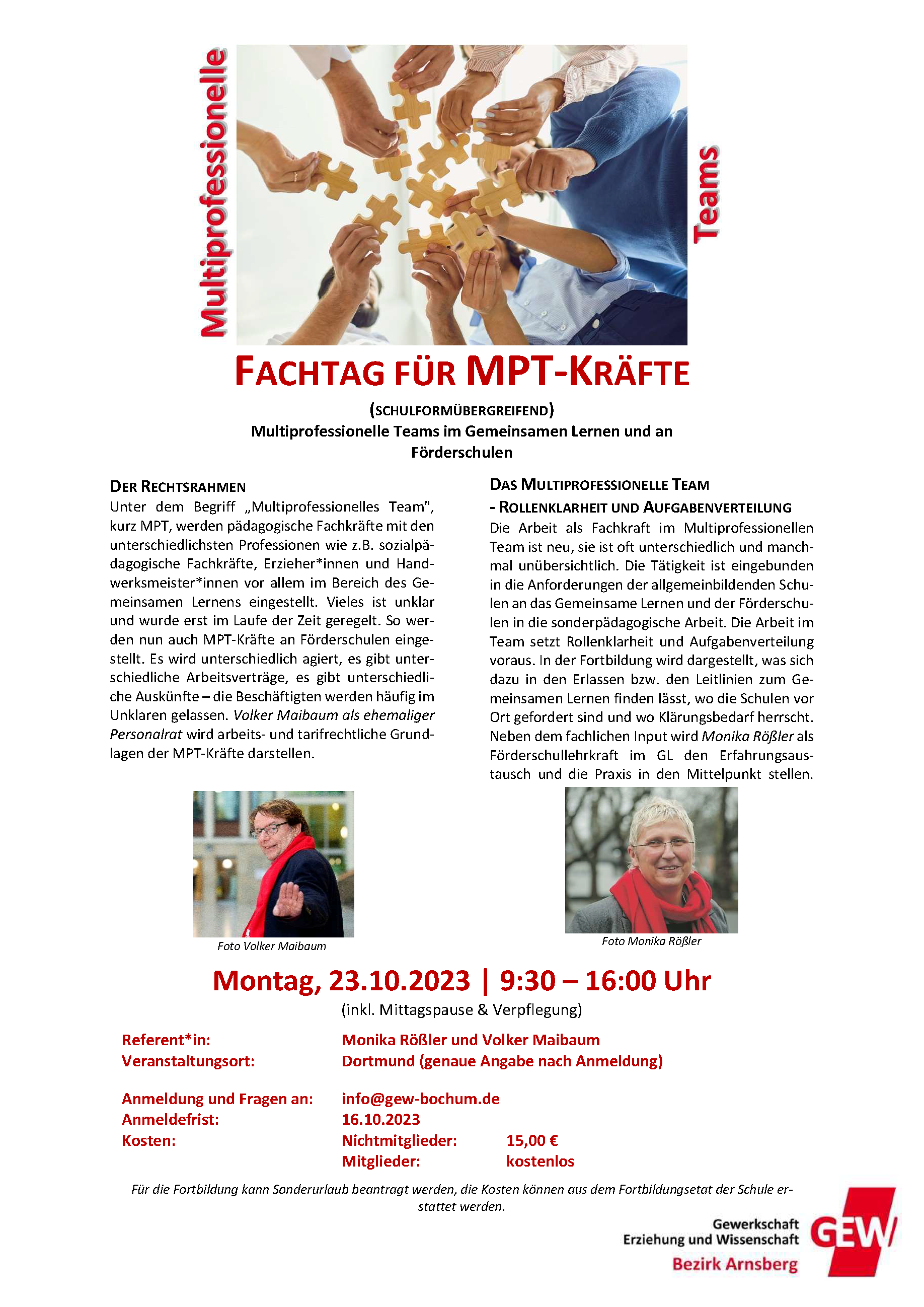 Der GEW-Bezirk Arnsberg bietet am 23.10.203 von 09:30 bis 16:00 Uhr in Dortmund einen schulformübergreifenden Fachtag für MPT-Kräfte an. Mit den beiden Referenten Volker Maibaum und Monika Rößler werden der Rechtsrahmen, als auch die Rollenklarheit und Aufgabenverteilung des Multiprofessionellen Teams, erläutert. Im Anschluss soll ein Erfahrungsaustausch erfolgen. Alle MPT-Kräfte sind herzlich eingeladen, an dem Fachtag teilzunehmen. Wir freuen uns auf einen interessanten Fachtag mit euch!